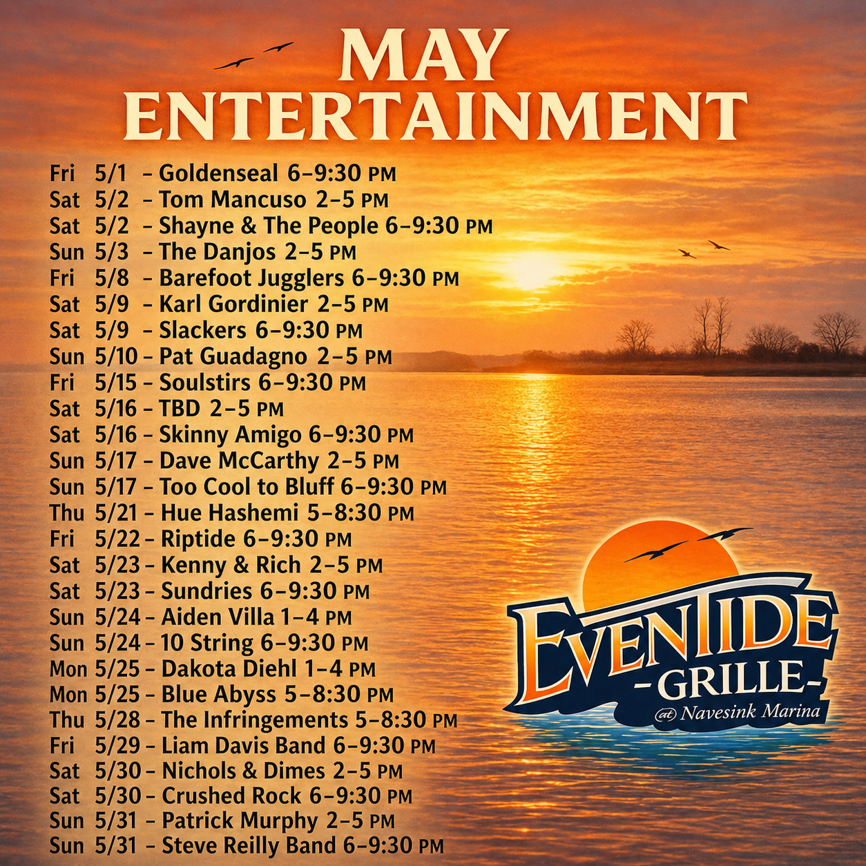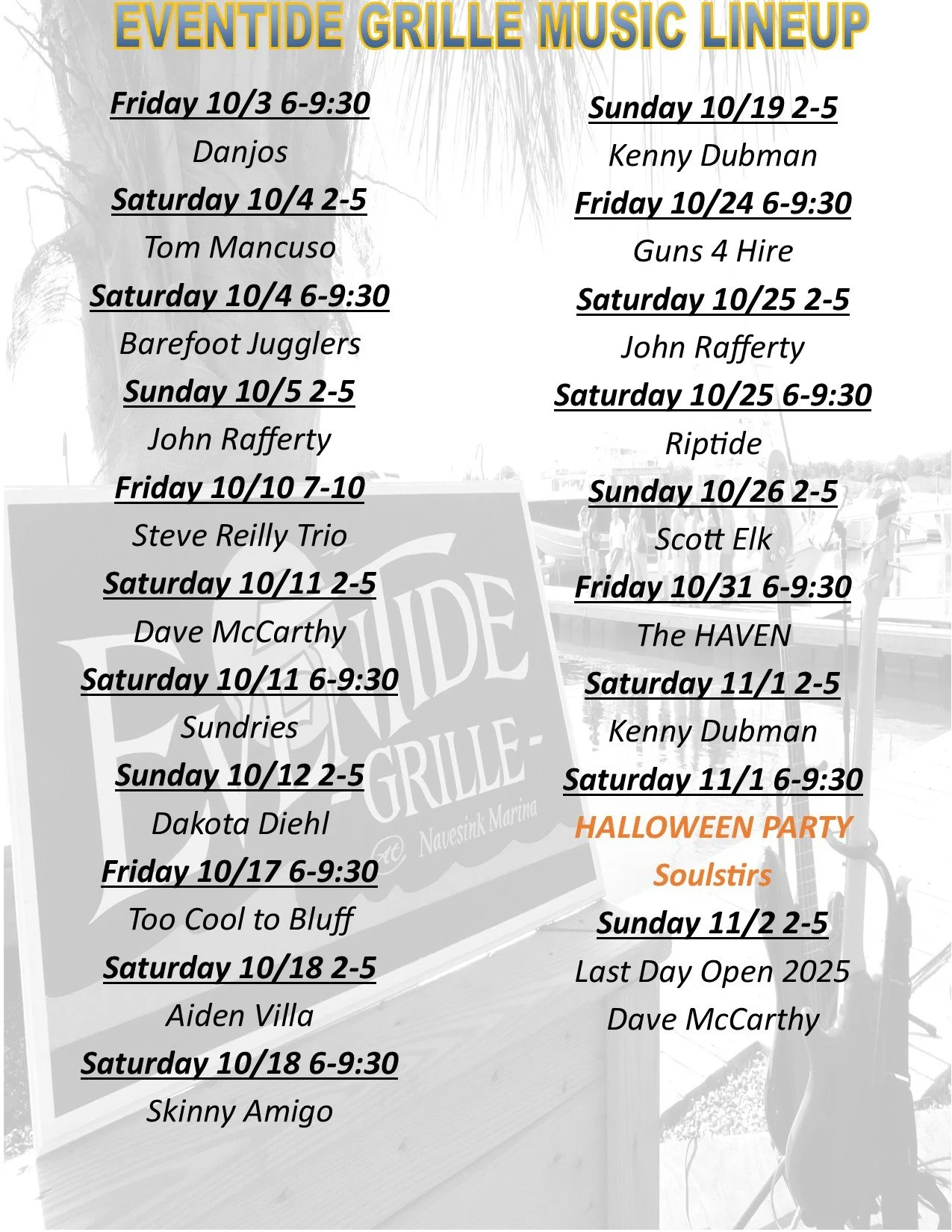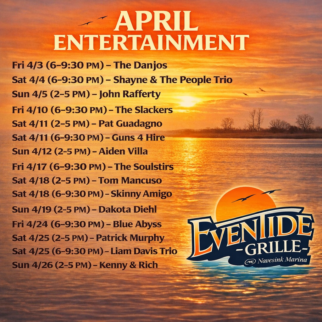 Eventide Grille at Navesink Marina is a true neighborhood restaurant that welcomes all, from singles to families, to the young and the young at heart. The name "Eventide" references dusk or sunset, and it alludes to calm water.